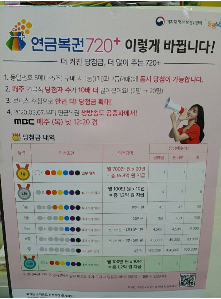 Mar 27, 2021 · 2020년 5월 7일 추첨부터 연금복권 720+로 개편되면서 1등 당첨금이 매달 500만 원에서 700만 원으로 늘어났다. 1등 당첨자는 각각 매월 500만원씩 20년간 받게 된다. 요괴들이 훔쳐가는 로또볼 되찾으러 가기 명중률 오류 수정 완료. Apr 23, 2020 · 기존과 다르게 연금복권 720+의. 연금복권 720의 1등 당첨 금액은 200만 원이